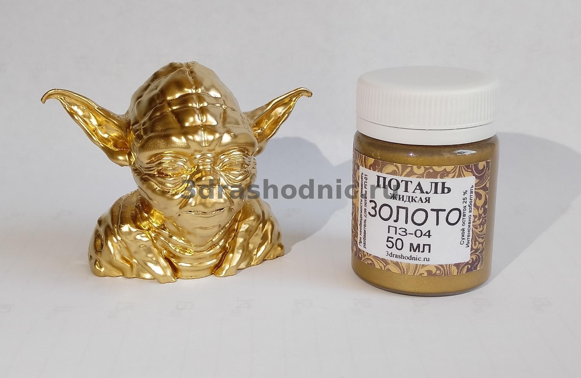 Жидкая поталь представляет собой акриловую композицию, смесь синтетических смол и металлических пигментов, имитирующую цвет и блеск сусальных листов, таких как золото, серебро, бронза и медь. Жидкая поталь не тускнеет и не теряет внешний вид, при этом стоимость этого материала гораздо ниже, чем листовая поталь. Жидкую поталь можно использовать для отделки изделий из дерева, стекла, металла, керамики, гипса, картона, пластмассы и многих других.