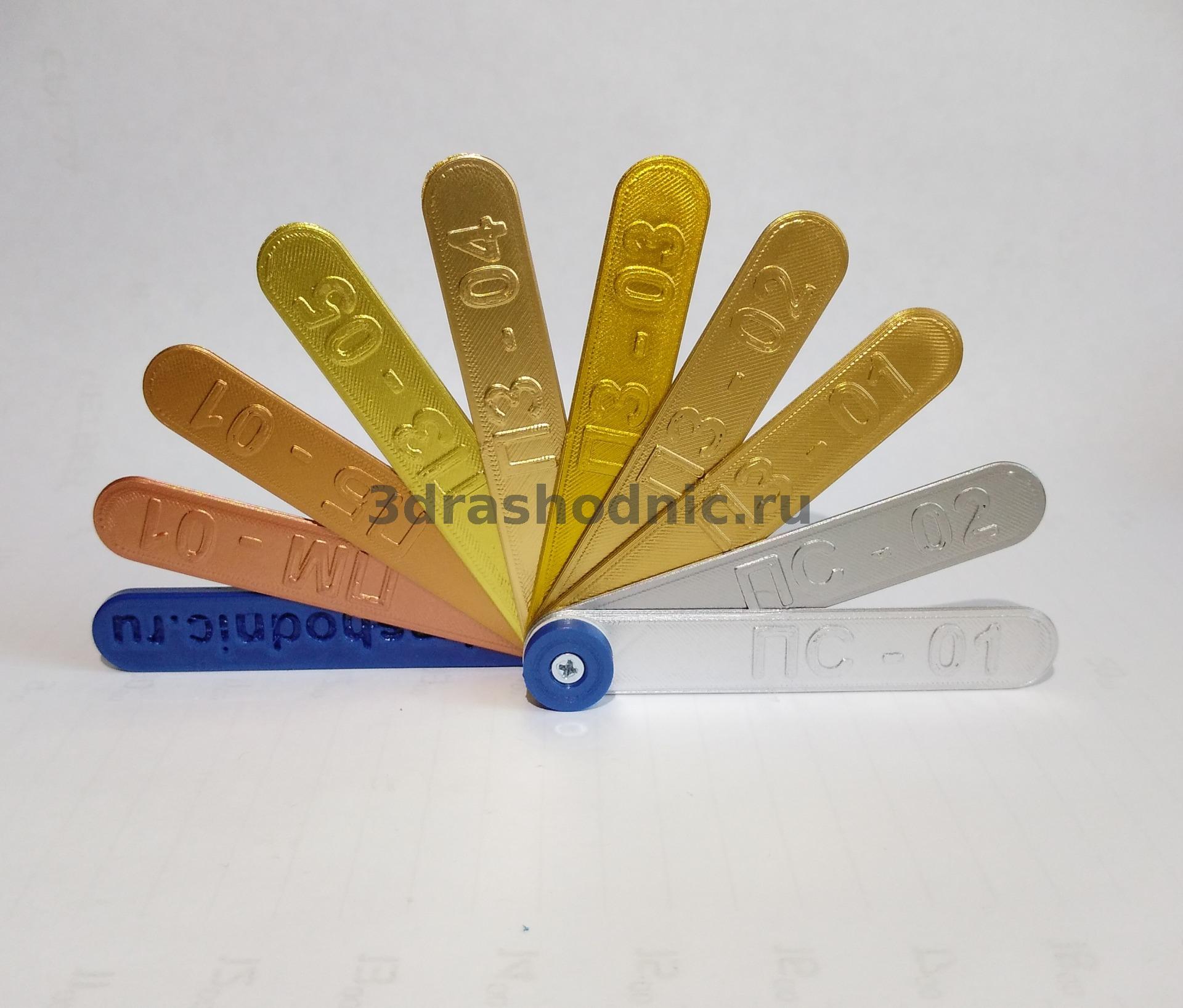 - Цвет: золото (ПЗ-01), яркое золото (ПЗ-02), желтое золото (ПЗ-03), розовое золото (ПЗ-04), зелёное золото (ПЗ-05), серебро (ПС-01), серебро чернёное (ПС-02), медь (ПМ-01), бронза (ПБ-01).